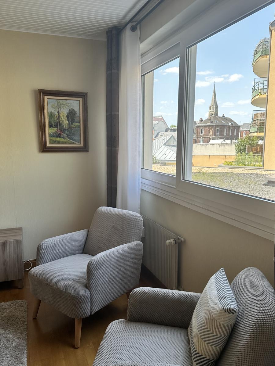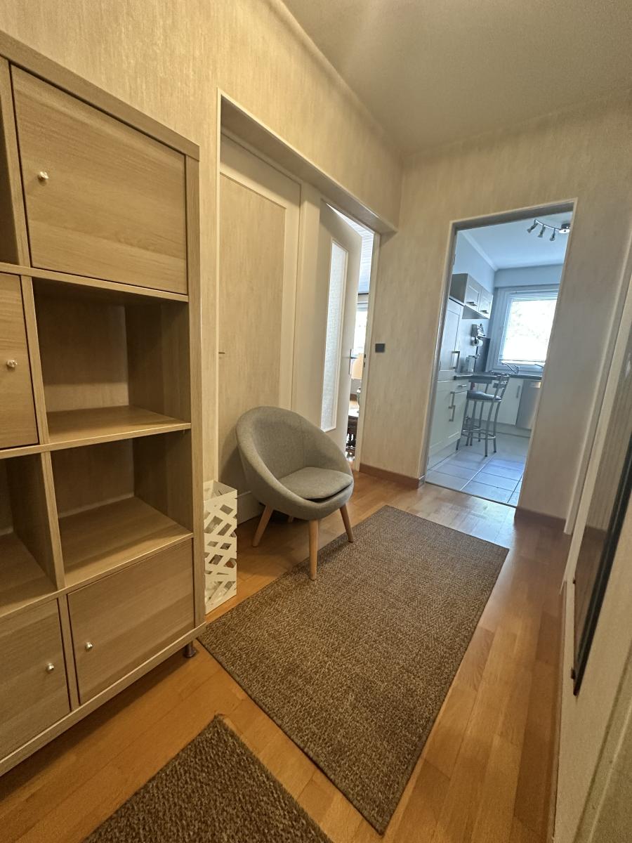Entrée avec grand placard, séjour - salon lumineux (possibilité 2ème chambre), cuisine aménagée et équipée, chambre, salle de douches, W.C.